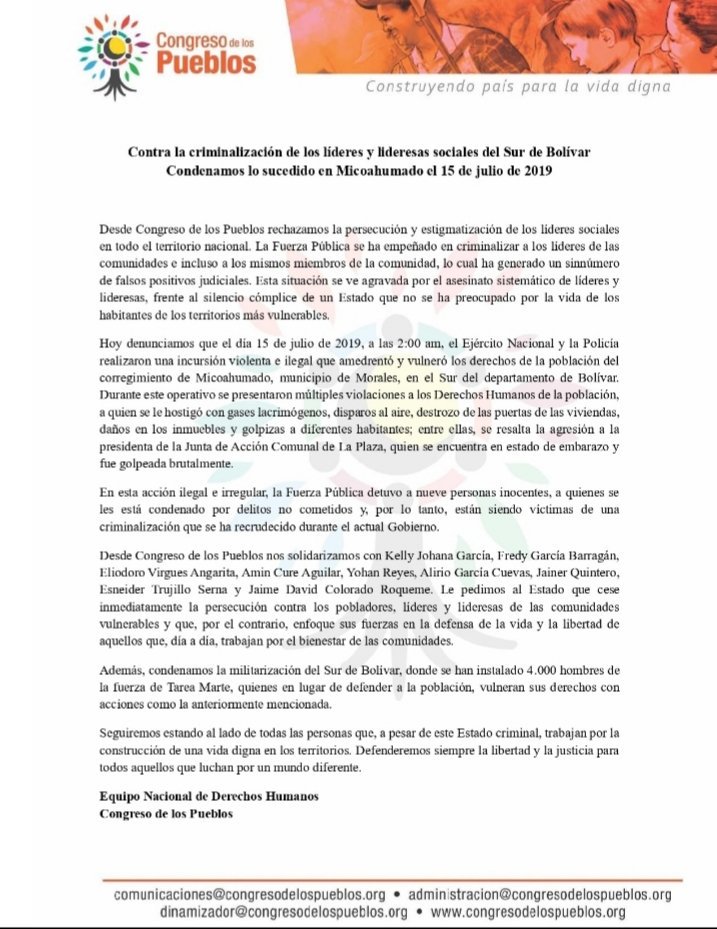 Through a joint communiqué, the inhabitants and social and peasant organizations of Micoahumado, such as Proceso Ciudadano Comunitario por la Vida, la Justicia y la Paz de Micoahumado, Federación Agrominera del Sur de Bolívar, Corporación Sembrar,* denounced that “the soldiers entered violently, firing shots, breaking the doors and causing damage to the houses, taking people by force, they were not allowed to dress or put on shoes and the presence of minors was not respected.”